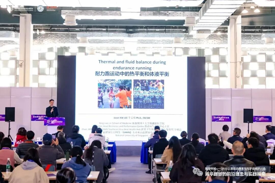在主旨演讲环节,多位专家围绕路跑运动的科学训练与康复主题展开深度分享。陈世益教授以《路跑常见运动损伤的防治与康复》为题,结合丰富临床案例,系统解析了常见跑步损伤的成因与康复策略;Jason Kai Wei LEE(李家炜)教授聚焦《湿热环境下长跑运动员的体温调节》,分享了高温高湿环境下的运动表现与体温管理最新研究成果,并为跑者提供了科学的补液策略指导;邱俊强教授则在《路跑人群的营养需求与解决方案》中,从运动生物化学的视角切入,深入剖析了路跑人群在不同训练阶段的营养需求特点,并就能量代谢与营养补给提出了专业建议。