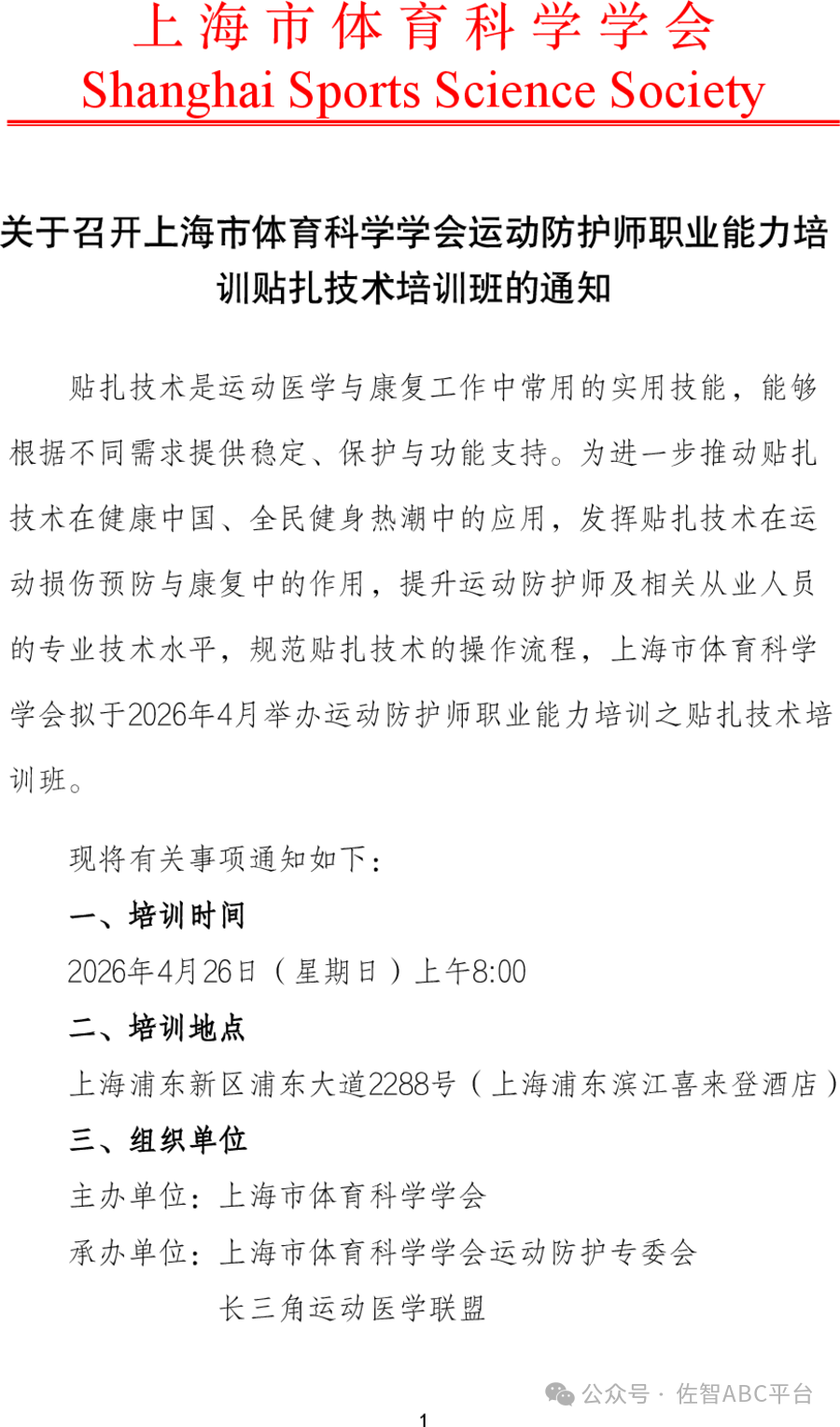 上海市体育科学学会|关于召开上海市体育科学学会运动防护师职业能力培训贴扎技术培训班的通知