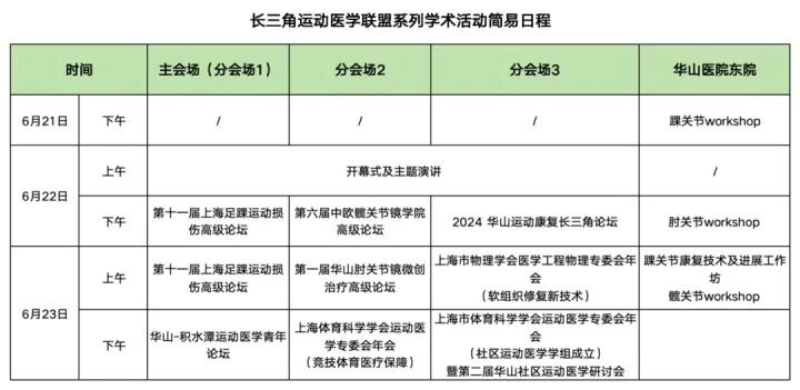 为进一步夯实长三角运动医学联盟的内涵,促进运动医学学科的发展,第二届“长三角运动医学论坛”系列学术活动于2024年6月21-23日在上海举行。