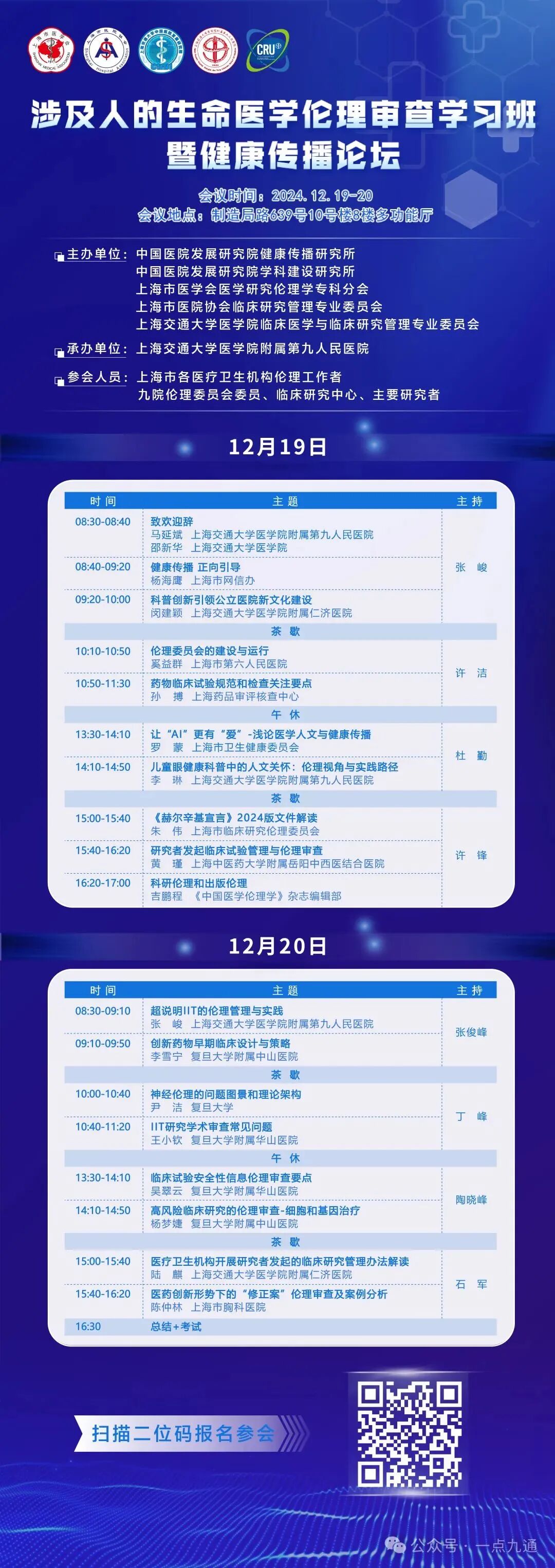 由上海交通大学医学院附属第九人民医院举办的市级继续教育项目“涉及人的生命医学伦理审查学习班暨健康传播论坛”,定于2024年12月19日-20日在上海举办。随着生命科学生物技术的快速发展,医学伦理学问题日益凸显,干细胞/体细胞研究、器官移植、人工智能技术、基因诊断与基因治疗等新技术应用中出现的伦理问题日趋复杂。加之近年,有关部委先后发布了《涉及人的生物医学研究伦理审查办法》、《药物临床试验质量管理规范(2020版)》、《涉及人的生命科学和医学研究伦理审查办法》等法规。一方面,作为研究者在开展临床研究研究时需要掌握GCP、伦理知识,符合法规要求;另一方面,医院伦理管理人员及各类临床研究从业者需要响应科技伦理治理的风向,适应更新更高的伦理标准。