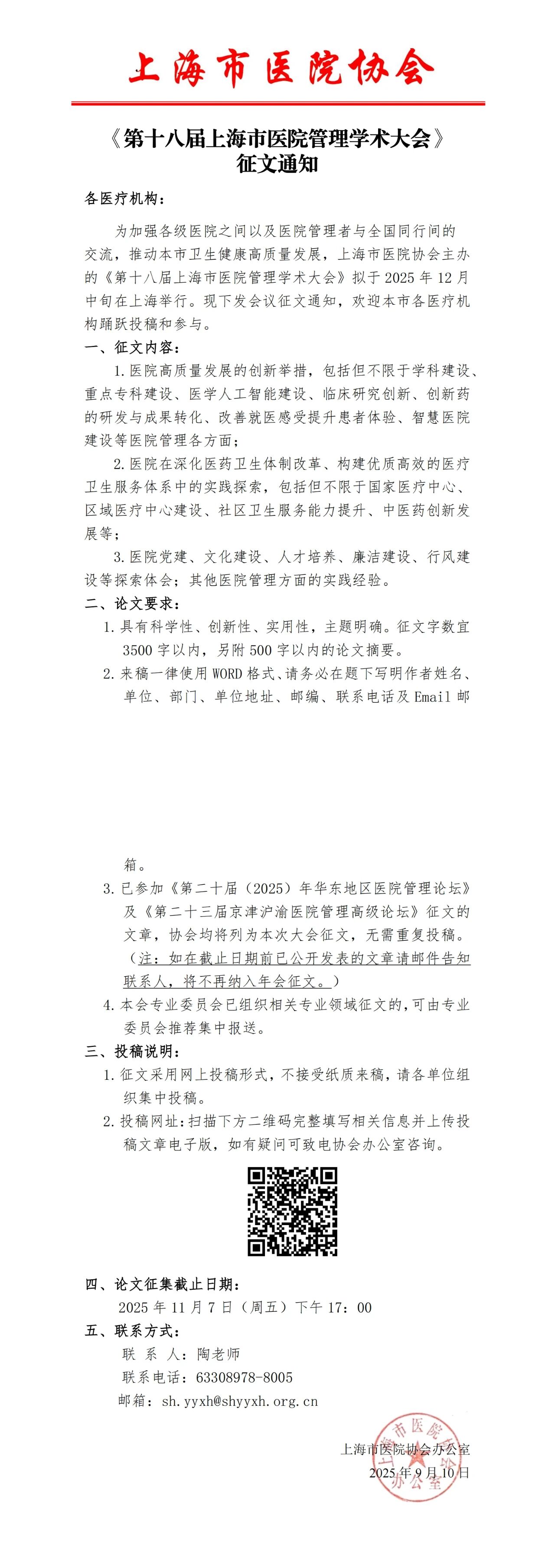 为加强各级医院之间以及医院管理者与全国同行间的交流,推动本市卫生健康高质量发展,上海市医院协会主办的《第十八届上海市医院管理学术大会》拟于 2025 年 12月中旬在上海举行。现下发会议征文通知,欢迎本市各医疗机构踊跃投稿和参与。