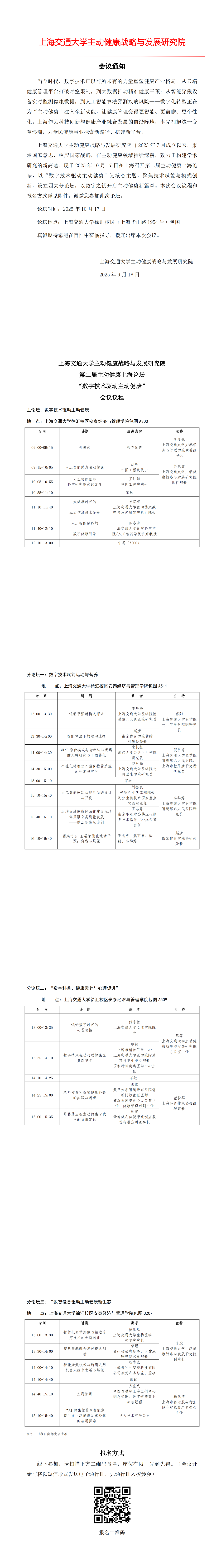 上海交通大学主动健康战略与发展研究院自 2023 年 7 月成立以来,秉承国家意志,响应国家战略,在主动健康领域持续深耕,致力于构建学术研究的新高地。现于 2025 年 10 月 17 日在上海召开第二届主动健康上海论坛,以“数字技术驱动主动健康”为核心主题,聚焦技术赋能与模式创新,设立四大分论坛,以数字之钥开启主动健康新篇章。本次会议议程和报名方式详见附件,诚邀您参加此次论坛。