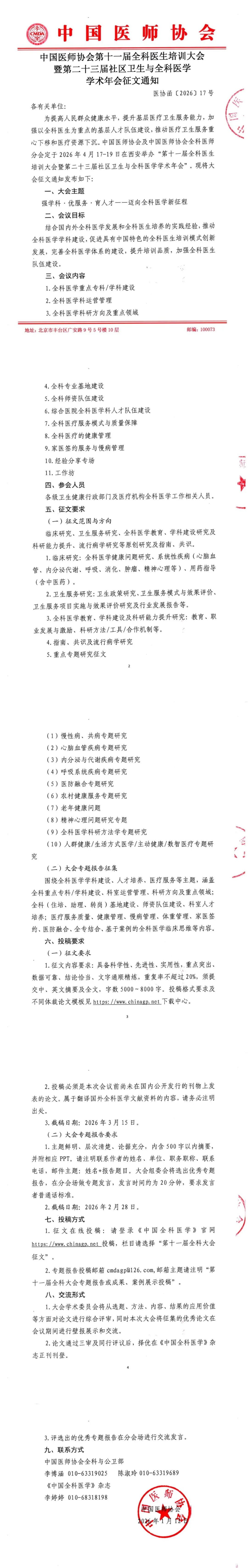 为提高人民群众健康水平,提升基层医疗卫生服务能力,加强以全科医生为重点的基层人才队伍建设,推动医疗卫生服务重心下移和诊疗资源下沉。中国医师协会及中国医师协会全科医师分会定于2026年4月17—19日在西安举办“第十一届全科医生培训大会暨第二十三届社区卫生与全科医学学术年会”。现将大会征文通知发布如下: