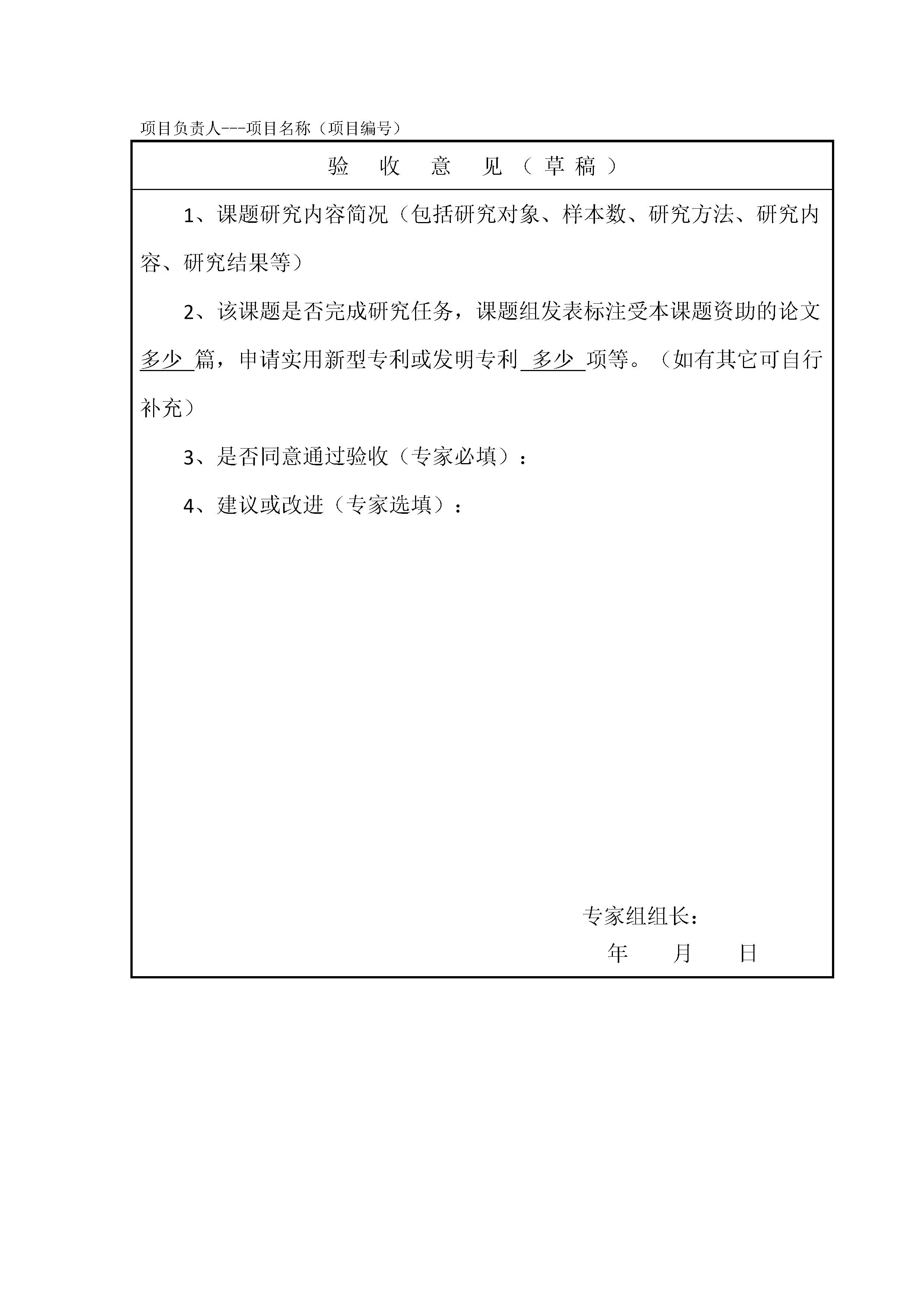 (四)参加验收项目负责人自拟验收意见草稿(参照附件1),简要阐明课题主要研究内容、对照计划任务书完成情况等,要求四号字、宋体,不超过500字,并在附件1中填写前两条验收意见。