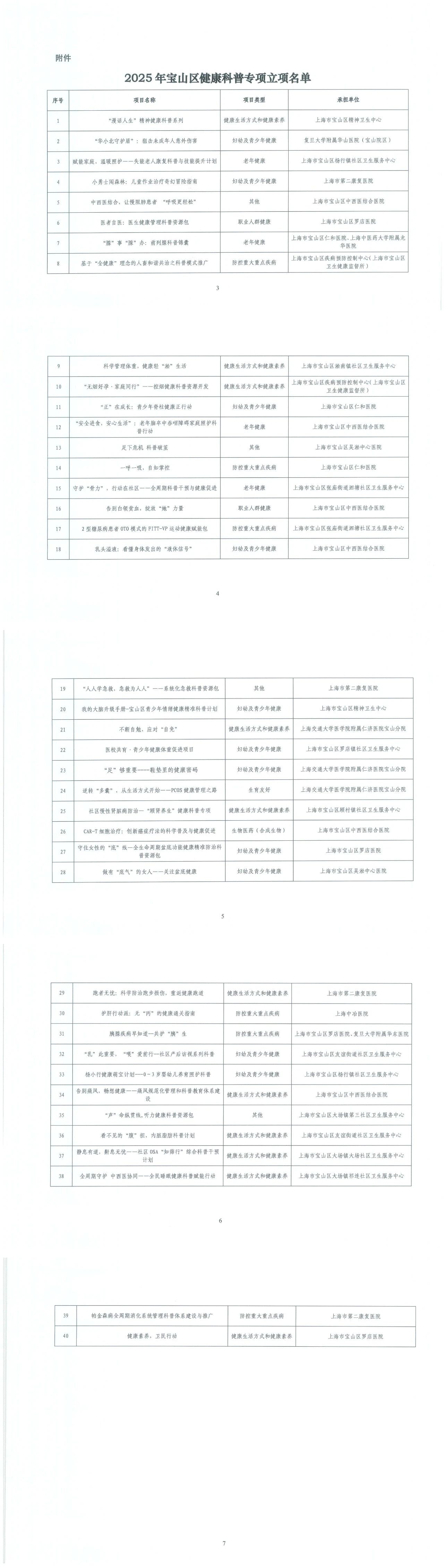 根据《关于开展2025年宝山区健康科普专项申报的通知》(宝科委〔2025〕16号),区科委(协)联合区卫生健康委组织了2025年宝山区健康科普专项的申报、评审工作。经单位推荐、材料审查、专家评审及社会公示等程序,现决定对《“漫话人生”精神健康科普系列》等40个项目予以立项(具体立项名单详见附件)。