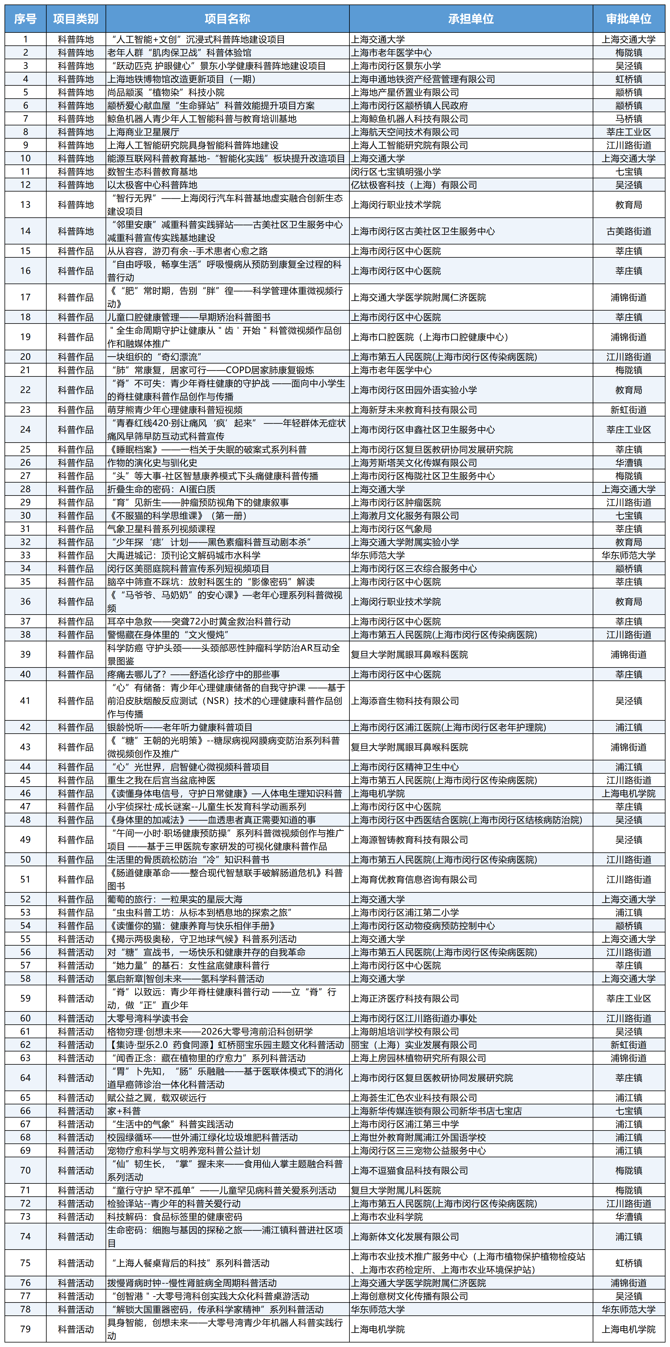 为支持和鼓励全社会开展科普活动,闵行区科委科协开展了2026年度闵行区科普项目申报工作,经专家评审,现将拟立项的2026年度闵行区科普项目名单予以公示。