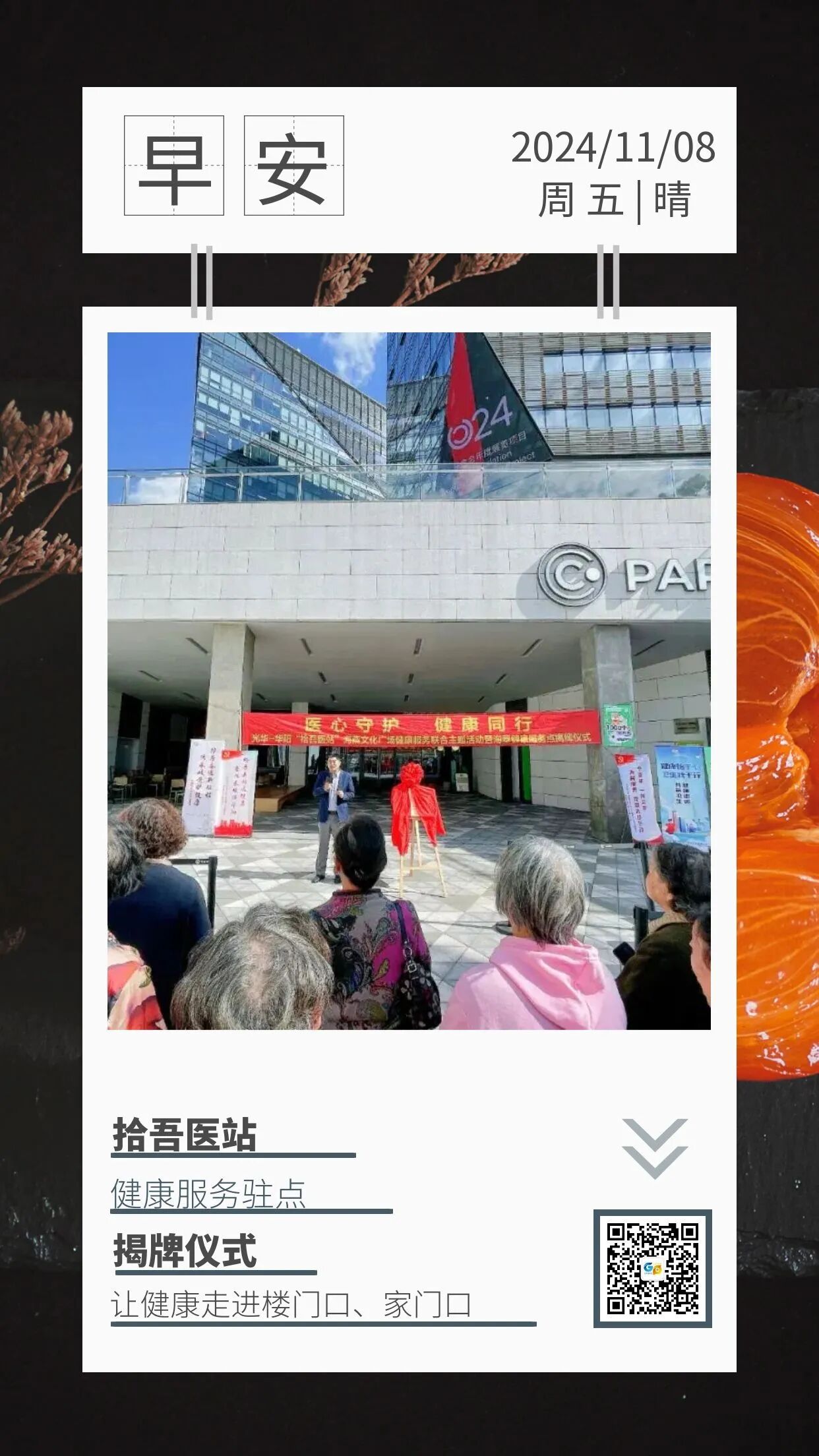 为持续推进学习贯彻习近平新时代中国特色社会主义思想的深化和转化工作,进一步学习贯彻党的二十届三中全会精神,华阳社区卫生服务中心党支部积极结合“一个支部一件实事”项目,不断提升“拾吾医站”和功能社区服务内涵,2024年11月6日中午,在海粟文化广场下沉式广场开展“医心守护•健康同行”——光华-华阳“拾吾医站”海粟文化广场健康服务联合主题活动暨海粟健康服务点揭牌仪式。