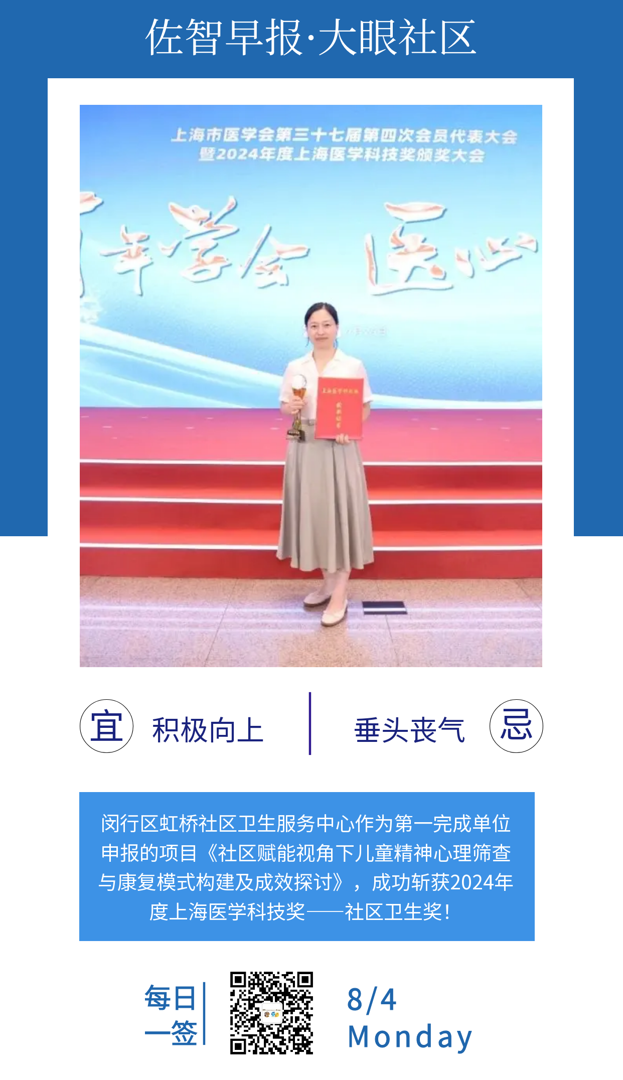 热烈祝贺,由闵行虹桥社区卫生服务中心作为第一完成单位申报的项目《社区赋能视角下儿童精神心理筛查与康复模式构建及成效探讨》,成功斩获2024年度上海医学科技奖——社区卫生奖!