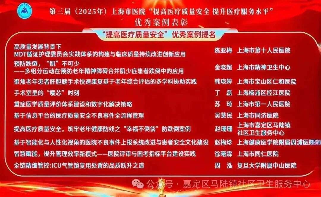 近日,在第三届(2025年)上海市医院"提高医疗质量安全 提升医疗服务水平"案例征集活动评选中,中心护理部赵珊珊投稿的案例《提高医疗质量安全,筑牢老年健康防线之"幸福不倒翁"防跌倒案例》荣获“优秀案例提名”。