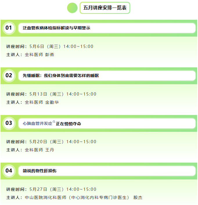 全民参与:4-5 月连续 9 场公益讲座开讲,覆盖居家止痛、血管警示、慢病防控、用药安全,零级预防走进千家万户。
