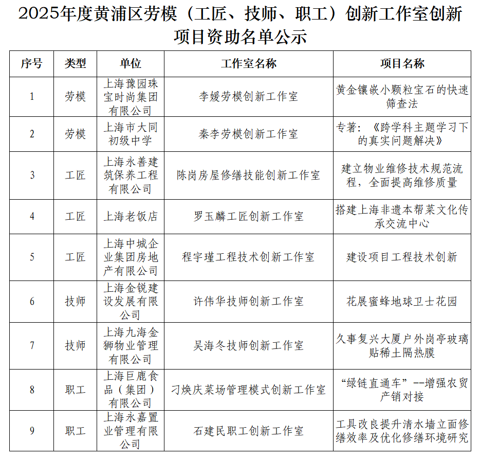 为深入贯彻落实弘扬劳模精神、劳动精神、工匠精神的重要指示,充分发挥劳动模范、工匠、技师在推动黄浦经济社会高质量发展中的示范引领和骨干带头作用,根据《黄浦区劳模(工匠、技师、职工)创新工作室管理办法》(黄工总〔2021〕29号)文件要求,2025年度“黄浦区劳模(工匠、技师、职工)创新工作室”创评工作由各区管工会推荐申报,经区总工会综合考评,现决定将2025年度区级创新工作室及历年创新工作室项目资助候选对象予以公示。