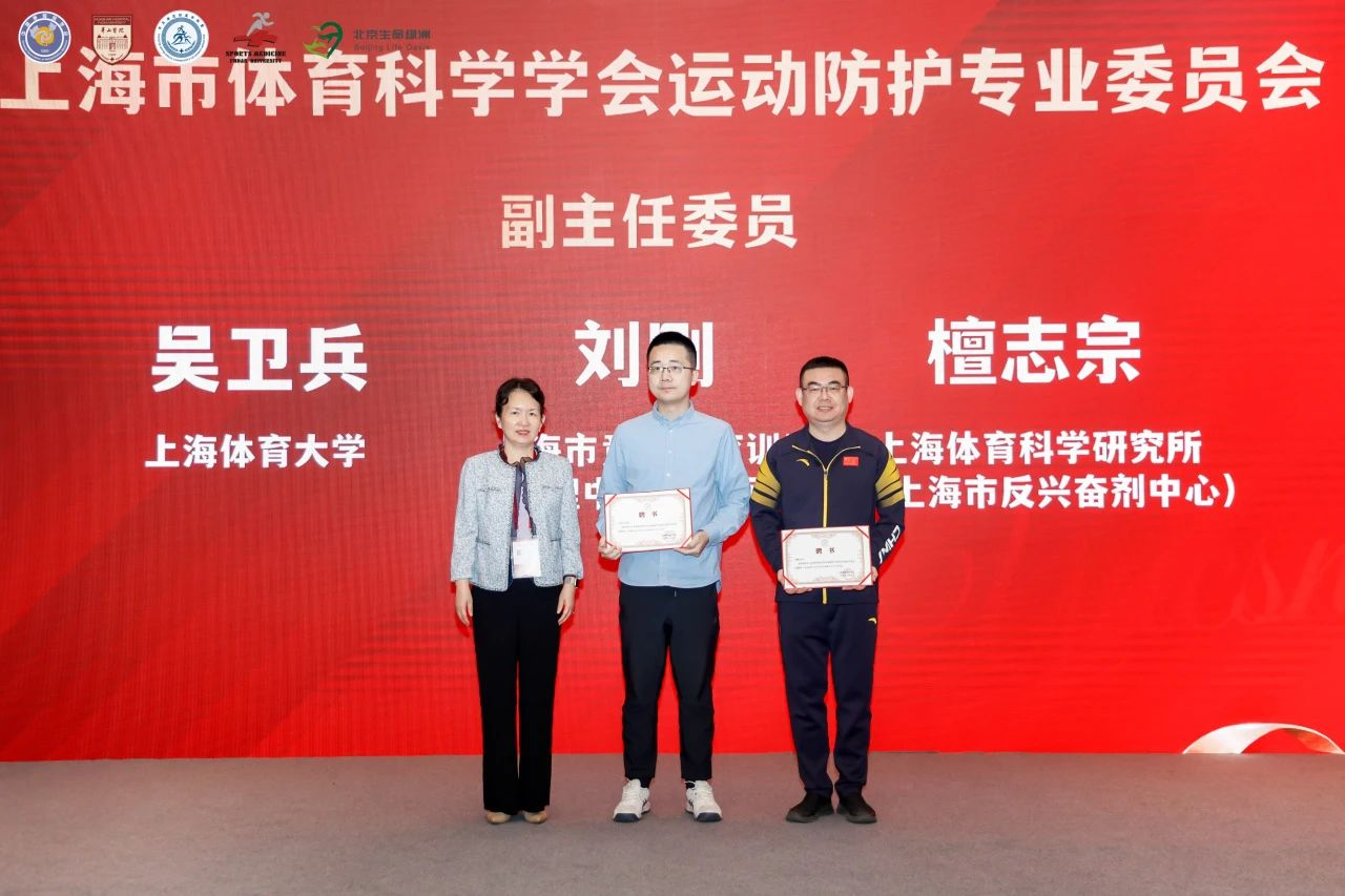 上海市体育科学学会秘书长邱俊为上海市体育科学学会运动防护专业委员会副主任委员檀志宗、吴卫兵、刘刚颁发证书
