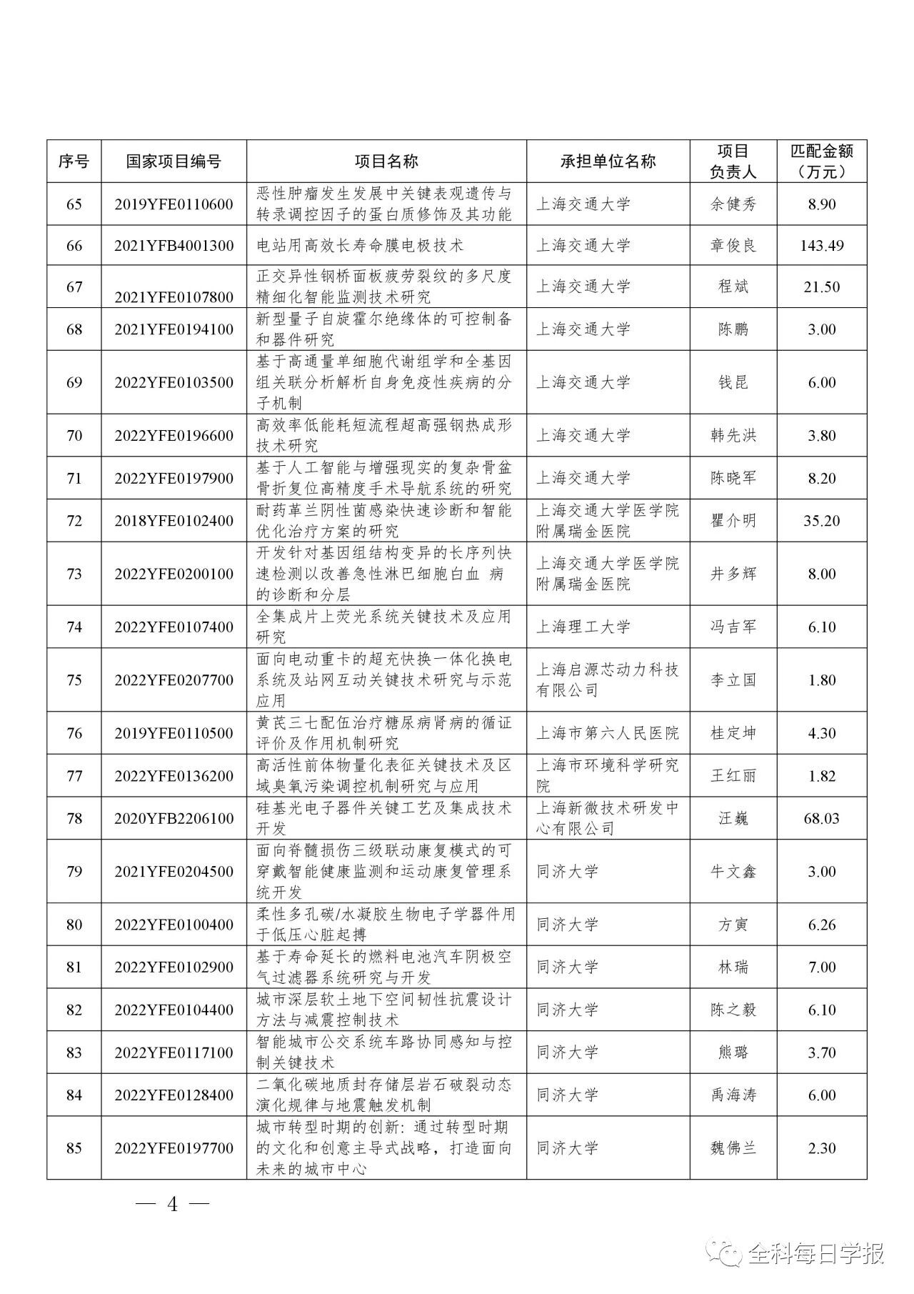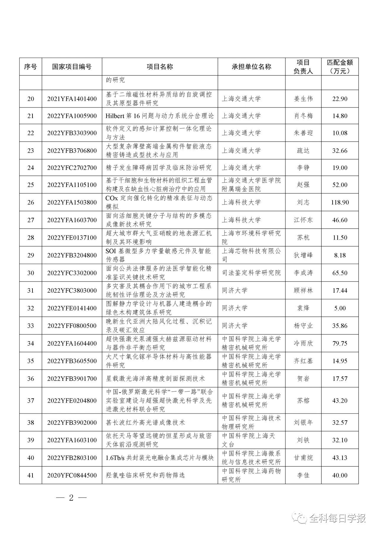 附件:国家重要科技计划项目上海市地方匹配资金2023年第三批匹配项目清单