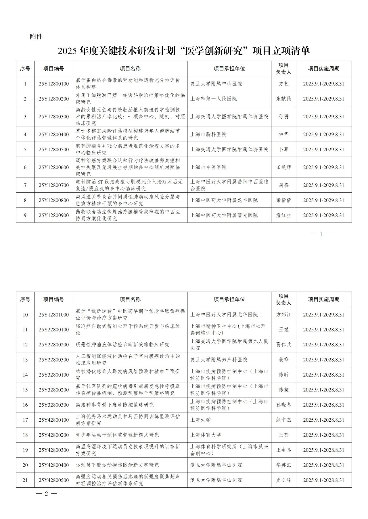 根据《上海市科学技术委员会关于发布2025年度关键技术研发计划“医学创新研究”项目申报指南的通知》(沪科指南〔2025〕18号)要求,经申报推荐、形式审查、专家评审、立项公示等程序,现对“基于蛋白结合毒素的肾功能和透析充分性评价体系构建”等21个项目予以立项,市科委资助6300万元,其中2025年拨款5040万元。请各项目承担单位做好项目组织实施和管理工作,确保按期完成项目研究任务目标。