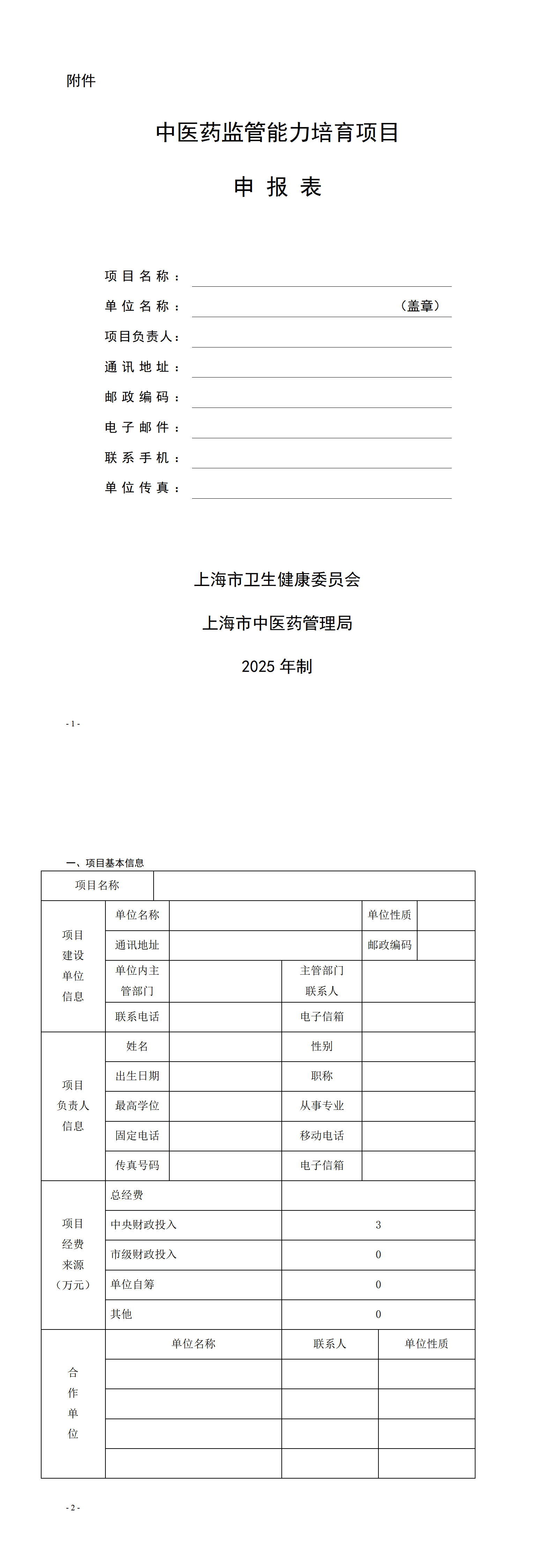 3.各单位根据申报要求和流程,填报《中医药监管能力培育项目申报表》(见附件,从市卫生健康委网站下载),经审核后于2025年4月3日前由相关推荐单位统一将申报材料(一式5份并附电子版)报送至我委。