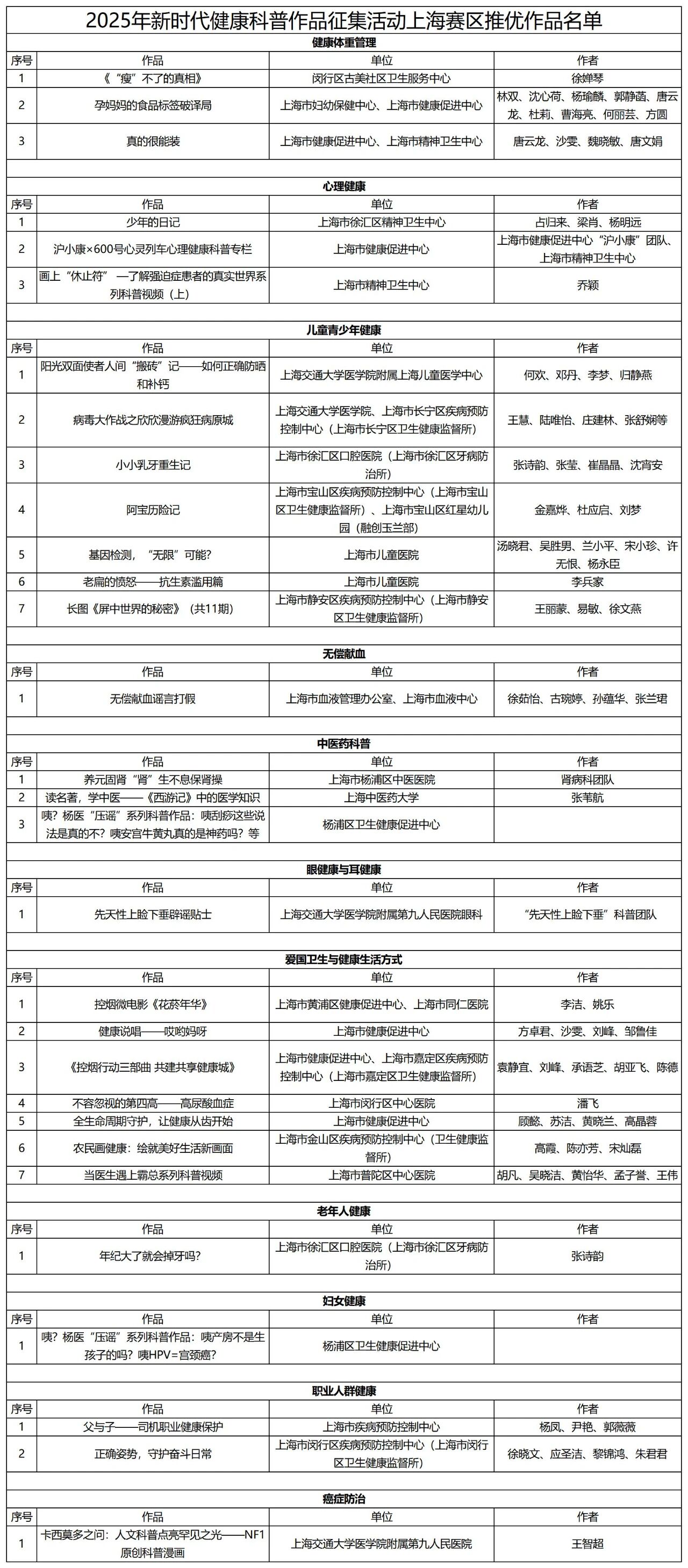 全市共收到作品1900余件,其中符合要求的作品为1716件,包含“第三届上海市健康科普引领展示活动暨新时代健康科普大赛”中涌现出的部分优秀科普作品。经过专家筛选,拟将30件作品(见附件)作为优秀作品推荐至国家健康知识普及行动——2025年新时代健康科普作品征集活动。现将名单予以公示,公示时间为自公示之日起5个工作日。