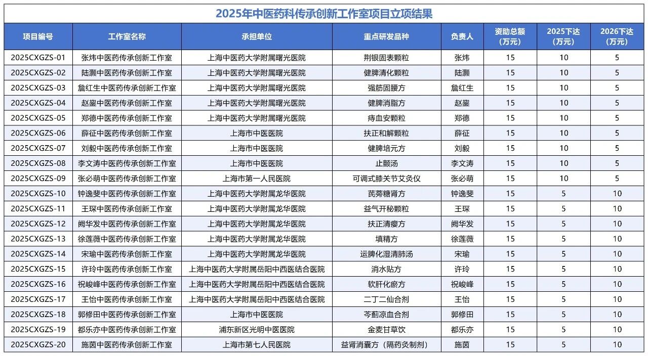 根据《上海市卫生健康委员会 上海市中医药管理局关于开展2025年中医药传承创新工作室建设项目申报的通知》(沪卫中发〔2025〕20号)部署,我委面向全市相关单位开展申报工作,经自主申报、单位推荐、形式审查、专家评审等环节,对20个中医药传承创新工作室建设项目予以立项(见附件)。