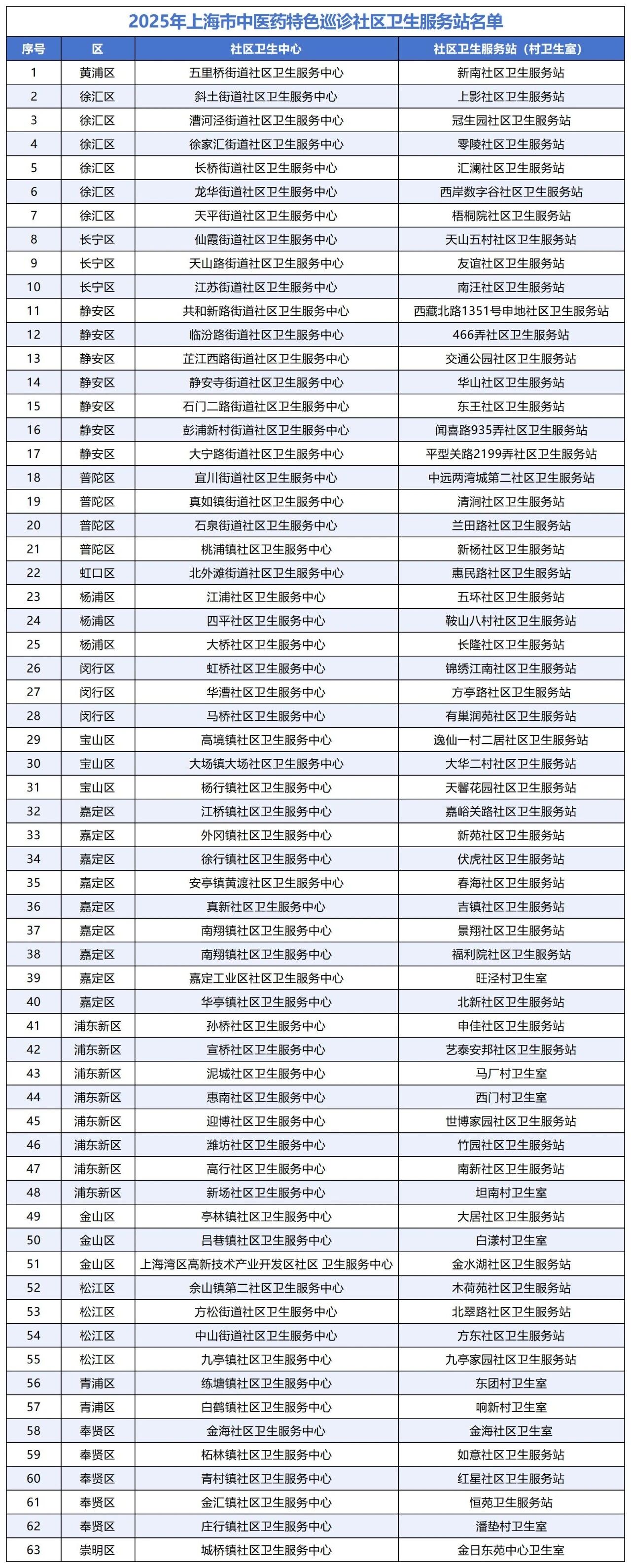 为深入推进基层中医药服务高质量发展,进一步提升本市社区卫生服务站中医药服务能力,打造申城“最后一公里”中医药特色服务品牌,根据《关于开展中医药特色巡诊服务的社区卫生服务站建设的通知》(沪卫中管〔2025〕4号)等要求,经组织专家验收,黄浦区五里桥街道社区卫生服务中心新南服务站等63家建设单位达到中医药特色巡诊社区卫生服务站(以下简称中医巡诊站点)验收标准。现将名单予以公布,并就有关事项通知如下: