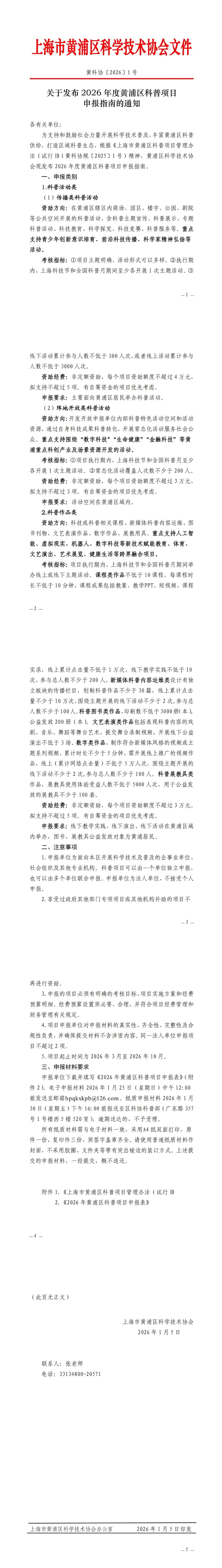 为支持和鼓励社会力量开展科学技术普及,丰富黄浦区科普供给,打造区域科普生态,根据《上海市黄浦区科普项目管理办法(试行)》(黄科协规〔2025〕1号)精神,黄浦区科学技术协会现发布2026年度黄浦区科普项目申报指南。