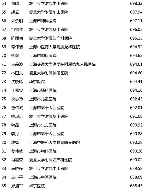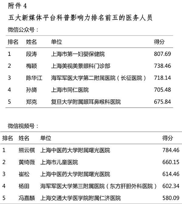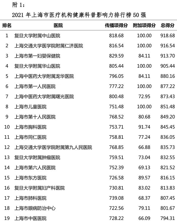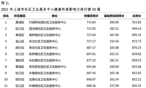 复旦大学附属中山医院、上海交通大学医学院附属仁济医院、上海市第一妇婴保健院等入选医疗机构健康科普影响力指数排行榜50强;黄浦区打浦桥街道社区卫生服务中心、松江区泗泾镇社区卫生服务中心、奉贤区南桥镇社区卫生服务中心等入选社区卫生服务中心健康科普影响力指数排行榜50强;段涛、崔松、杨阳等入选医务人员健康科普影响力指数排行榜100强。