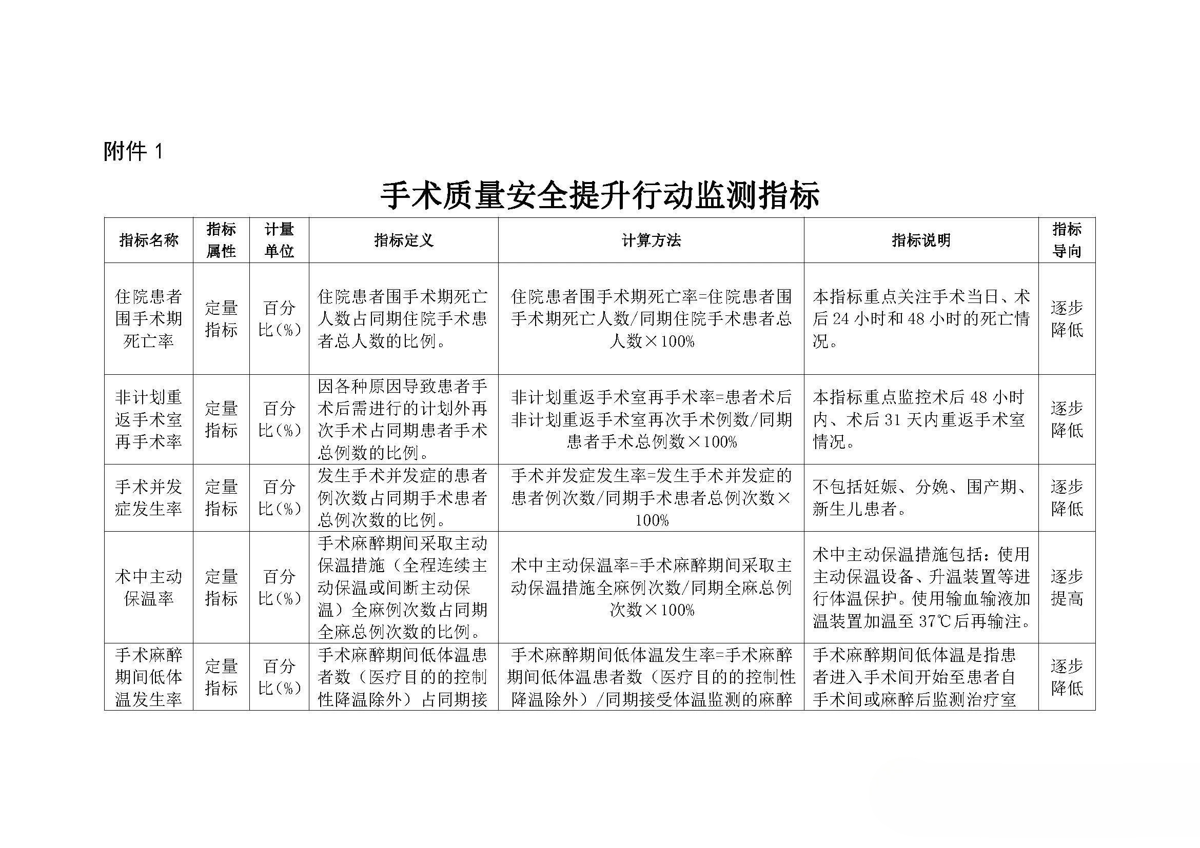 利用3年时间,进一步完善手术质量安全管理体系,形成科学规范、责权清晰、运行顺畅的管理机制。到2025年末,住院患者围手术期死亡、手术并发症、麻醉并发症等负性事件发生率进一步下降,非计划重返手术室再手术率不高于1.8‰,住院患者手术后获得性指标发生率不高于7.5‰,手术麻醉期间低体温发生率、I类切口手术抗菌药物预防使用率进一步降低,日间手术占择期手术的比例进一步提高,四级手术术前多学科讨论制度得到全面落实。