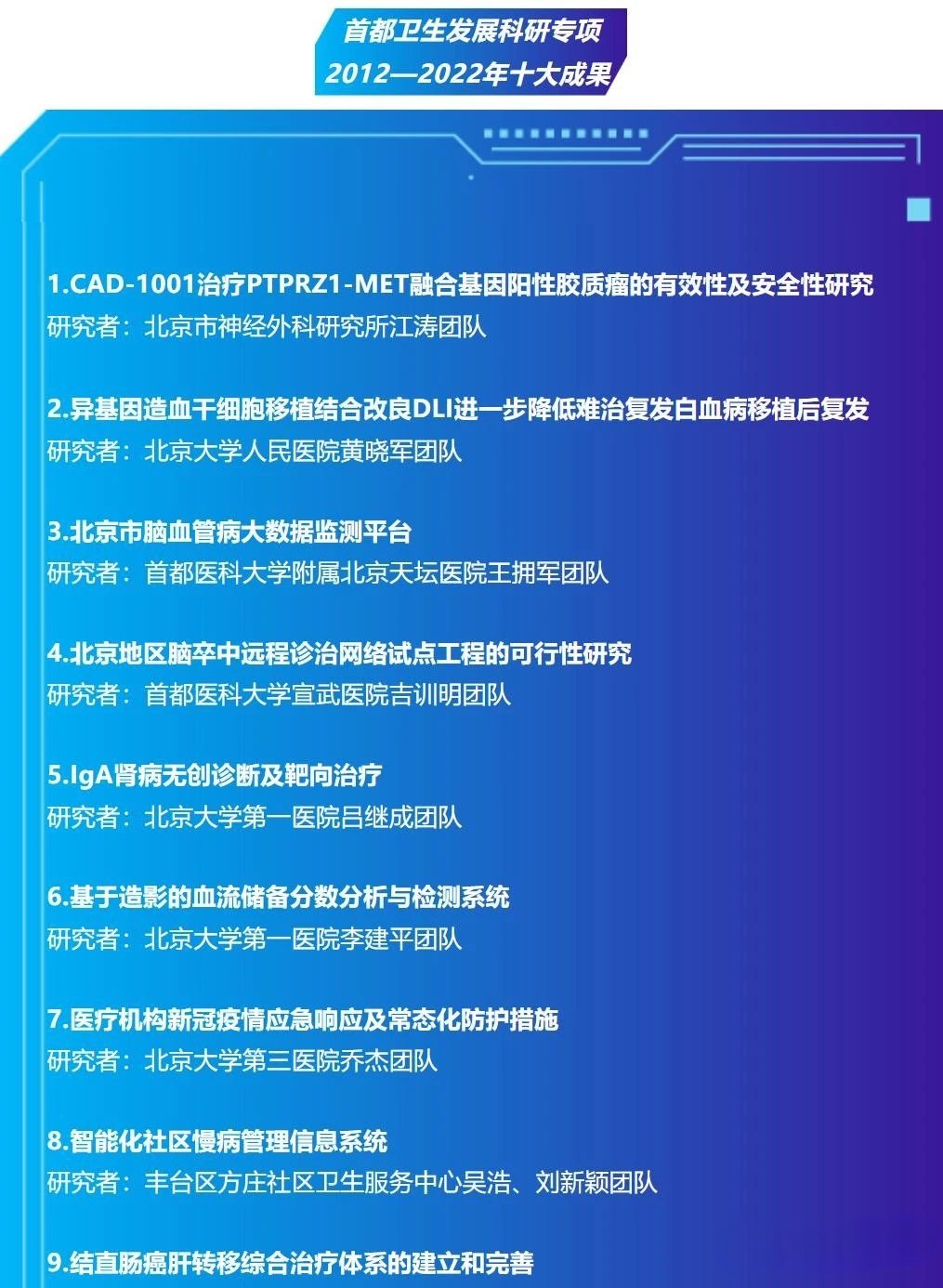 为发挥首发专项优秀项目的示范引领作用,北京市卫生健康委组织从1990个支持项目中精心筛选出196个亮点成果,优中选优,确定了“首都卫生发展科研专项2012—2022年十大成果”。名单如下: