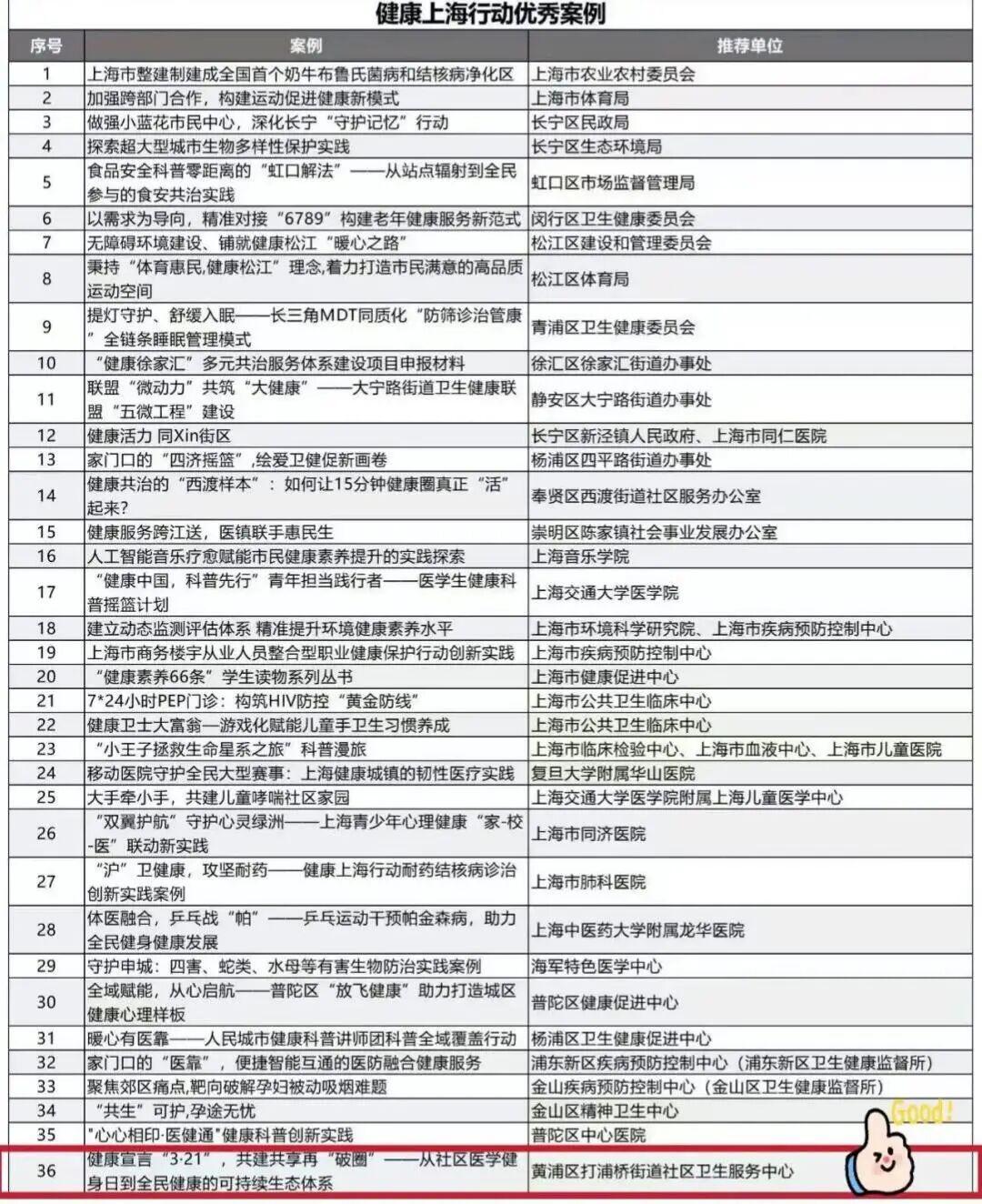 经由各方严格评定,中心申报案例《健康宣言“3·21”,共建共享再“破圈”——从社区医学健身日到全民健康的可持续生态》自328个申报案例中脱颖而出,入选健康上海行动优秀案例,成为名单中唯一入选的社区卫生服务中心!