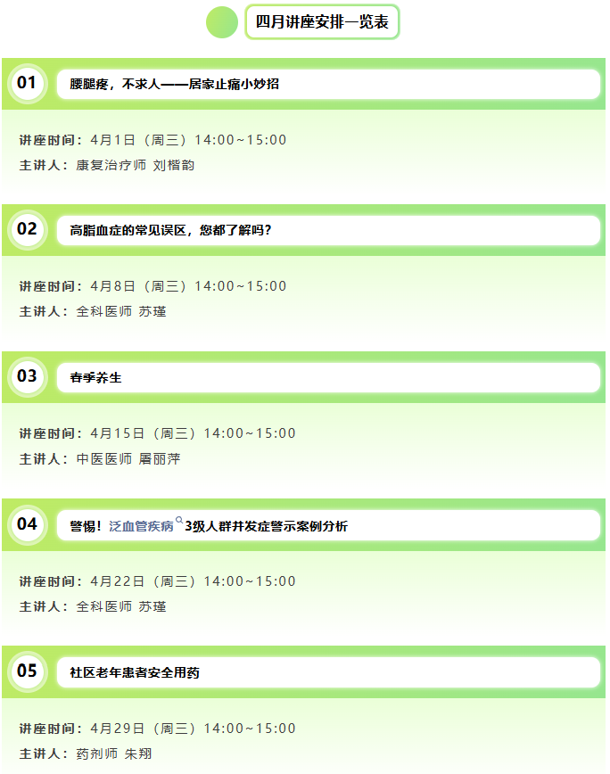 全民参与:4-5 月连续 9 场公益讲座开讲,覆盖居家止痛、血管警示、慢病防控、用药安全,零级预防走进千家万户。