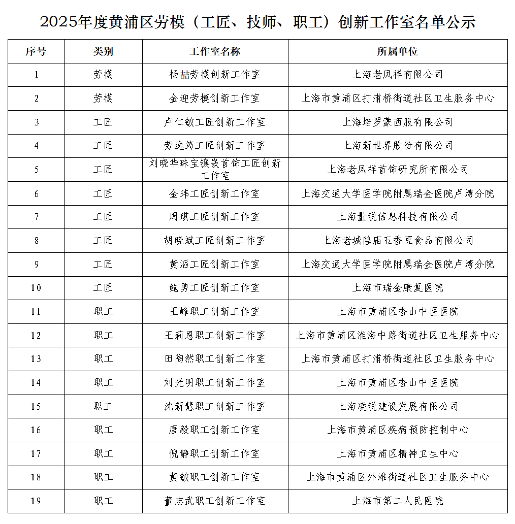 为深入贯彻落实弘扬劳模精神、劳动精神、工匠精神的重要指示,充分发挥劳动模范、工匠、技师在推动黄浦经济社会高质量发展中的示范引领和骨干带头作用,根据《黄浦区劳模(工匠、技师、职工)创新工作室管理办法》(黄工总〔2021〕29号)文件要求,2025年度“黄浦区劳模(工匠、技师、职工)创新工作室”创评工作由各区管工会推荐申报,经区总工会综合考评,现决定将2025年度区级创新工作室及历年创新工作室项目资助候选对象予以公示。
