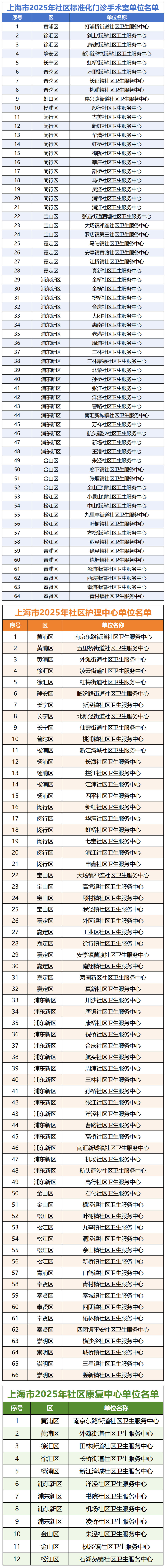 为进一步提升本市社区卫生服务能力,根据《上海市卫生健康委员会、上海市财政局关于做好2025年上海市为民办实事项目社区标准化门诊手术室、社区护理、康复中心建设的通知》(沪卫基层〔2025〕6号)要求,经组织专家验收和综合评估,今年全市有64家建设单位达到社区标准化门诊手术室建设要求,66家建设单位达到社区护理中心建设要求,12家建设单位达到社区康复中心建设要求。